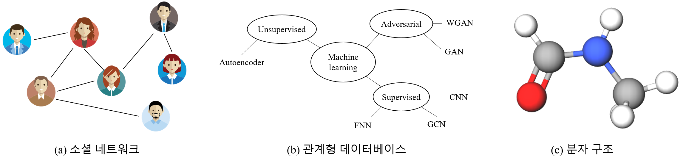 대부분의 머신 러닝 알고리즘은 입력 데이터가 유클리드 공간 (Euclidean space)에 존재함을 가정하고 있다. 즉, 통계 데이터나 이미지처럼 입력 데이터가 벡터의 형태로 표현될 수 있어야 한다. 그러나 소셜 네트워크, 관계형 데이터베이스, 분자 구조 등과 같이 객체들과 그 객체들 간의 관계로 표현되는 데이터 (그림 1)는 기본적으로 아래와 같이 그래프로 표현된다.