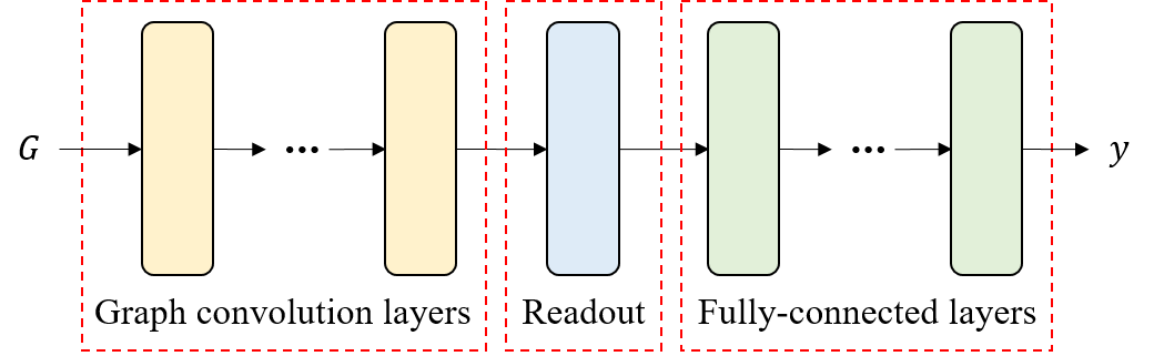 그림 5에서 readout은 graph convolution layer를 통해 생성된 latent feature matrix를 그래프 전체를 표현하는 하나의 벡터로 변환하는 함수이다. 일반적으로 readout은 전체 node의 latent feature vector를 평균내어 그래프 전체를 표현하는 하나의 벡터를 생성한다. Graph classification/regression에서는 readout이 필수적이지만, node classification이나 link prediction에서는 readout이 없는 구조를 이용한다.