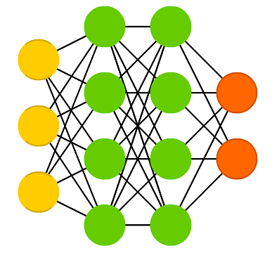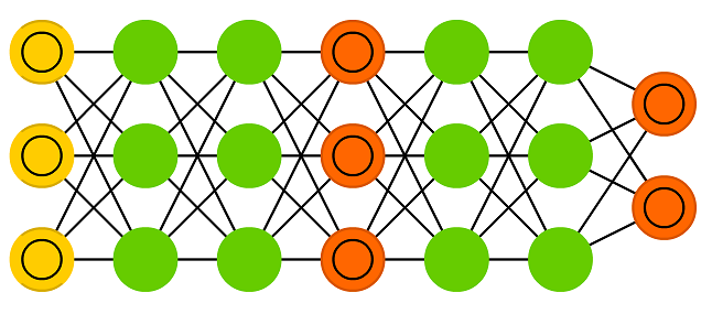 DFN은 딥 러닝에서 가장 기본적으로 이용되는 인공신경망이다. 그림에서도 볼 수 있듯이 DFN은 입력층, 은닉층, 출력층으로 이루어져 있으며, 보통은 2개 이상의 은닉층을 이용한다. DFN에서 입력 데이터는 입력층, 은닉층, 출력층의 순서로 전파된다.