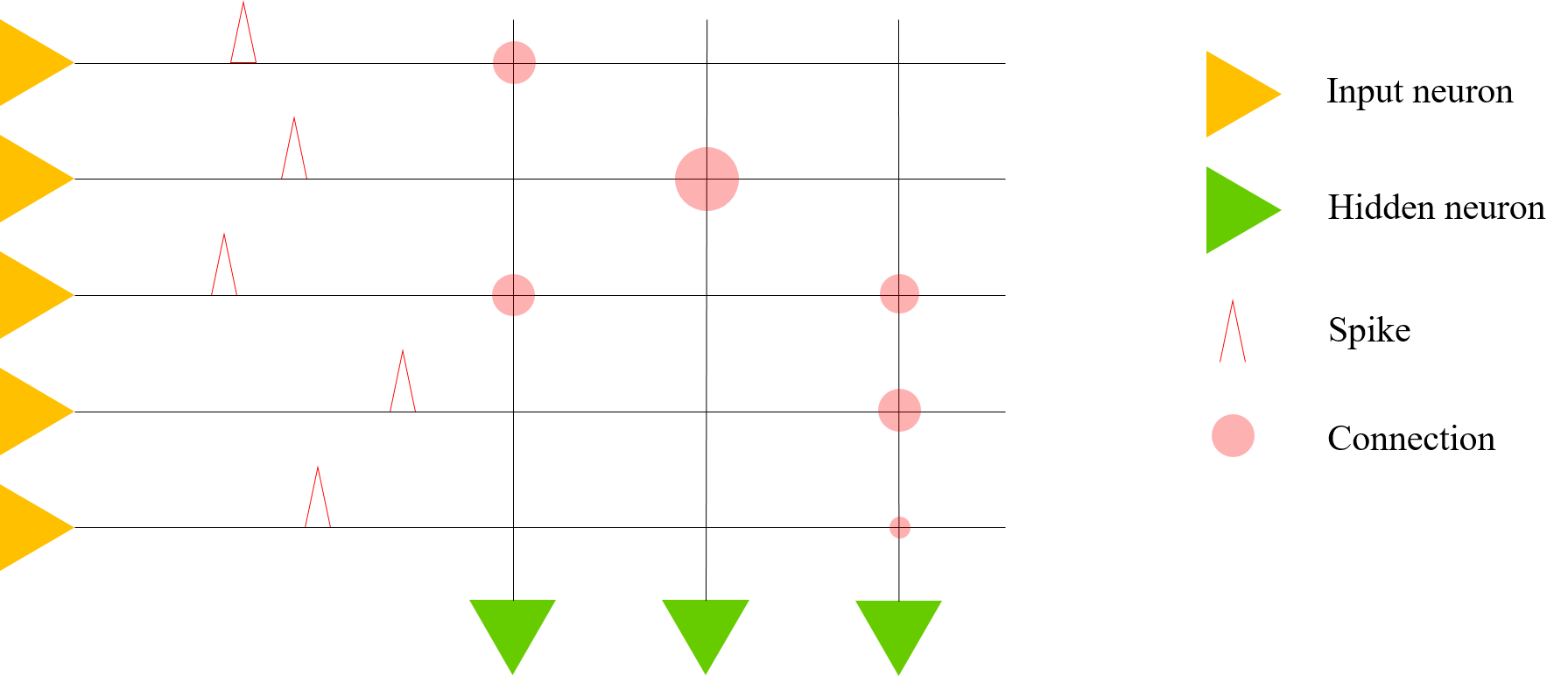 SNN은 기존 인공신경망보다 더욱 세밀하게 생물학적 뉴런을 묘사하기 위해 제안되었다. 그림 12와 같이 SNN에서의 각 뉴런은 완전 연결된 (fully-connected) 것이 아니라, 실제 생물의 뇌처럼 연관된 동작을 하는 뉴런들끼리만 연결되어 있다. 이에 더하여 기존의 인공 뉴런은 실수값을 출력했는데, SNN에서의 뉴런은 생물학적 뉴런의 전기 신호처럼 spike의 발생 여부를 나타내는 0 또는 1의 값을 출력한다. SNN 뉴런의 또 다른 특징은 뉴런 자체에서 시간에 따라 출력값이 변한다는 것이다. 이는 신경망 자체의 복잡성 증가 없이도 시간에 종속적인 데이터에 대한 처리가 가능함을 의미한다.