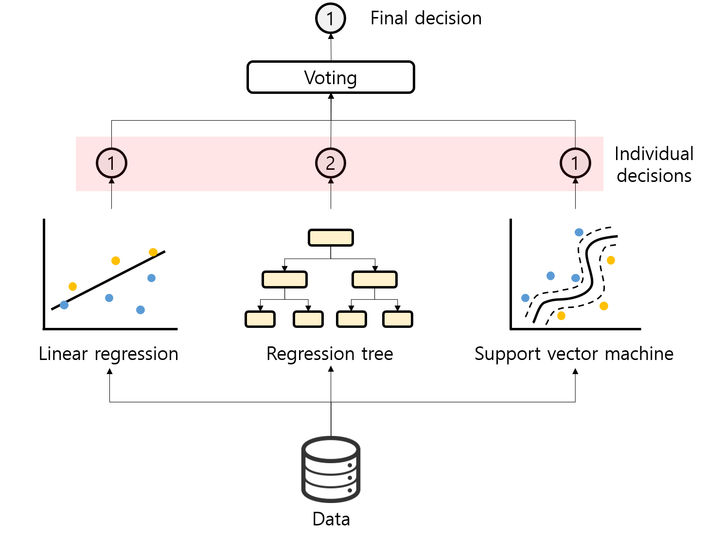 강력한 성능에 비해 의외로 앙상블 방법의 개념은 매우 단순하다. 앙상블 개념의 핵심 개념은 다양한 종류의 여러 estimator를 결합하여 더 좋은 estimator를 만드는 것이다. 앙상블 방법의 종류는 estimator들을 어떻게 결합할 것인지에 의해 결정된다. 가장 단순한 앙상블 방법으로는 그림 2와 같이 투표를 기반으로 base estimator들을 결합하여 최종 estimator를 만드는 것이 있다.