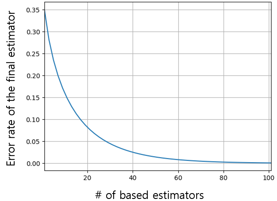 식 (1)에서 $k$를 $\text{ceil}(N/2)$부터 시작하는 이유는 과반수 이상의 estimator들이 오답을 내놓았을 때만 최종 estimator가 오답을 발생시키기 때문이다. 식 (1)이 의미하는 중요한 사실은 $p > 0.5$일 때 $N$이 증가할수록 $P_e$는 점점 감소한다는 것이다. 예를 들어, 그림 3은 정확도 $p$가 0.65일 때 $N$의 증가에 따른 $P_e$를 보여준다.