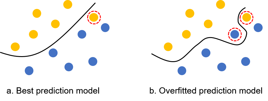 그림 2b와 같이 $\mathcal{D}_{train}$에 과하게 적합되어 예측 모델이 $\mathcal{D}_{train}$에서는 더 낮은 예측 오차를 보이지만 실제 $\mathcal{D}_{test}$에서는 더 높은 예측 오차를 보이는 것을 과적합 문제 (overfitting problem)이라고 한다. 과적합 문제는 대부분의 응용에서 발생하며 학습 데이터가 적거나 문제가 어려울수록 과적합의 정도가 심해진다.