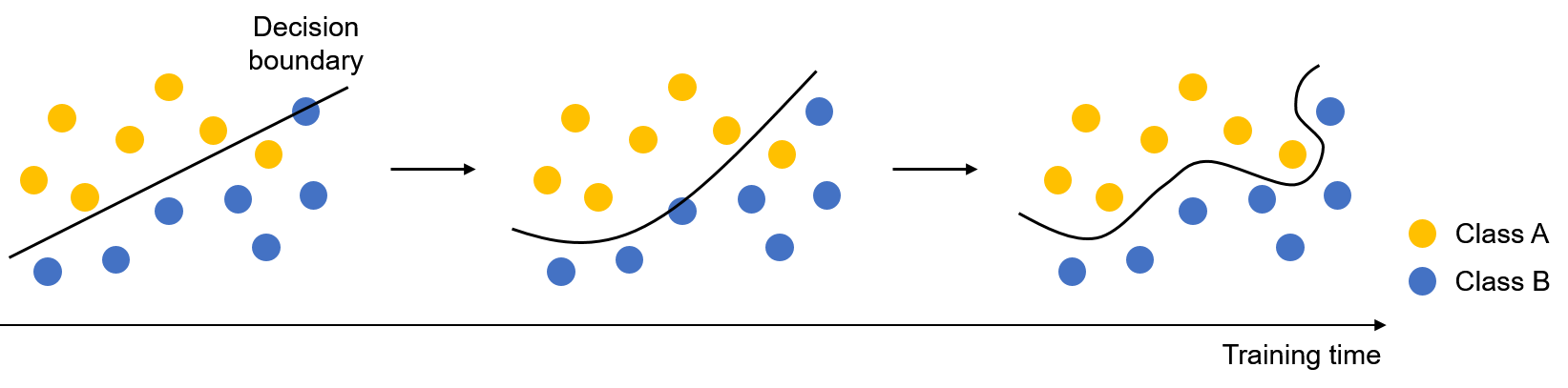 기본적으로 머신 러닝 모델은 $\mathcal{D}_{train}$에 대한 손실 함수 (loss function)가 작아지도록 학습을 진행하기 때문에 분류 문제의 경우 그림 1과 같이 학습이 진행될수록 모델의 decision boundary는 $\mathcal{D}_{train}$에 적합 (fitting)된다. 그러나 모델이 $\mathcal{D}_{train}$에 너무 과하게 적합되면 이것은 모델이 데이터에 내재된 어떠한 구조나 패턴을 일반화한 것이 아니라, $\mathcal{D}_{train}$에만 한정되는 정보를 그대로 외운 것과 같을 수 있기 때문에 이것이 올바른 학습 결과인지는 생각해볼 필요가 있다.