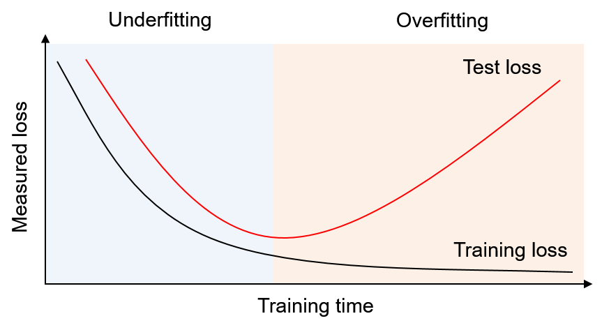 그림 5는 $\mathcal{D}_{val}$을 이용하여 과대적합을 방지하는 방법을 예측 오차의 관점에서 설명한다. 위의 그래프에서 묘사된 것과 같이 $\mathcal{D}_{val}$에 대한 예측 오차 (validation loss)가 증가하는 시점부터 과대적합이 발생했다고 판단하고, 이 시점에서 모델 학습을 중단한다. 그러나 $\mathcal{D}_{val}$ 또한 $\mathcal{D}_{test}$의 데이터 분포를 완벽히 표현하지는 못 하기 때문에 $\mathcal{D}_{val}$에 대한 예측 오차가 최소가 되는 시점이 $\mathcal{D}_{test}$에 대한 예측 오차가 최소가 되는 시점과 정확히 일치하지는 않을 수도 있다.