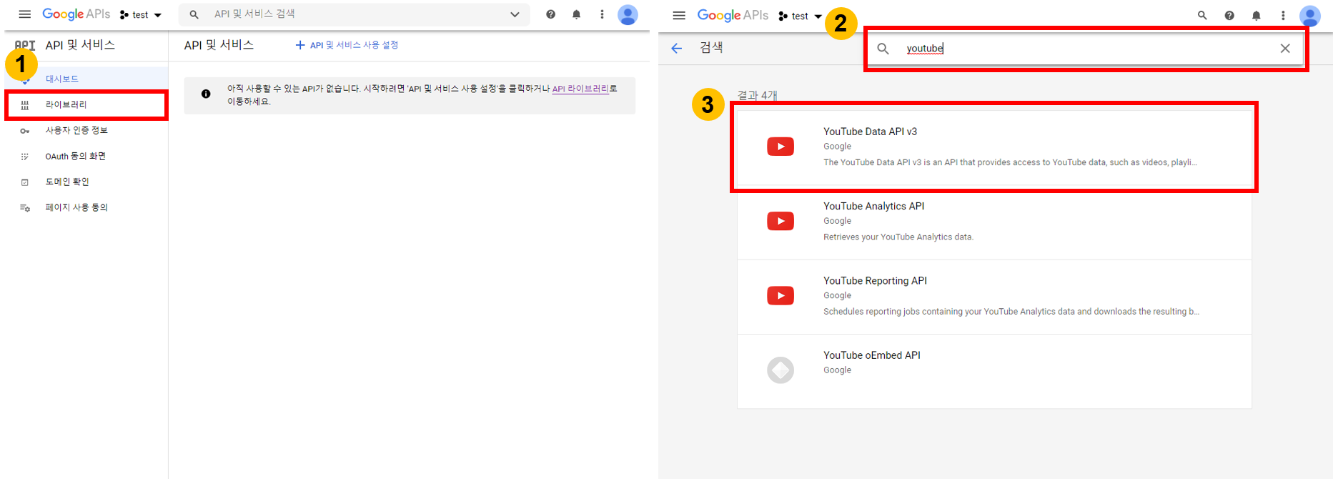 생성된 프로젝트에서 왼쪽의 라이브러리를 클릭하여 라이브러리 검색 화면으로 이동한다. 검색창에 "youtube"를 입력하고, 검색된 YouTube Data API v3를 클릭한다. 그 다음 이동된 화면에서 "사용"버튼을 클릭하여 YouTube Data API v3를 활성화한다. 활성화에는 약 1분 정도의 시간이 소요된다.