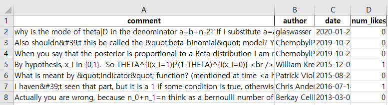 df.to_excel('results.xlsx', header=['comment', 'author', 'date', 'num_likes'], index=None)