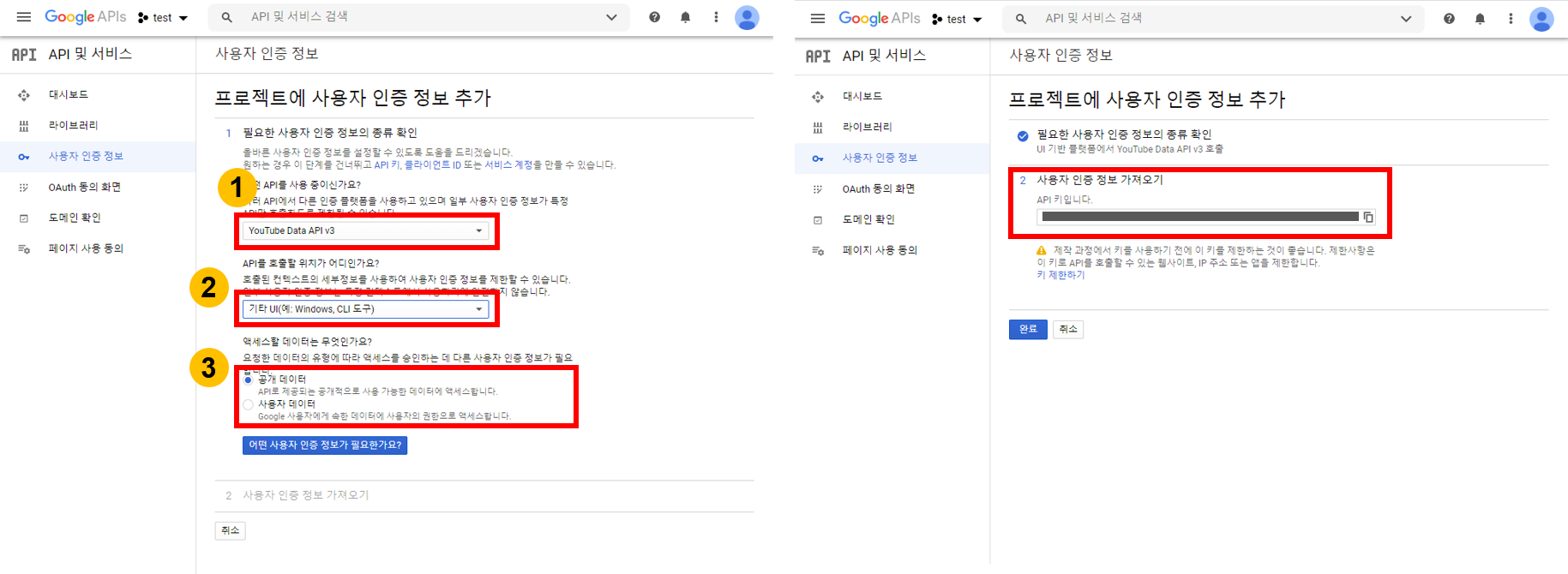 앞으로 YouTube Data API를 이용할 때는 발급 받은 API 키를 이용할 것이다. API 키는 API를 이용하기 위한 일종의 암호와 같은 것이기 때문에 노출하지 않도록 주의해야 한다.