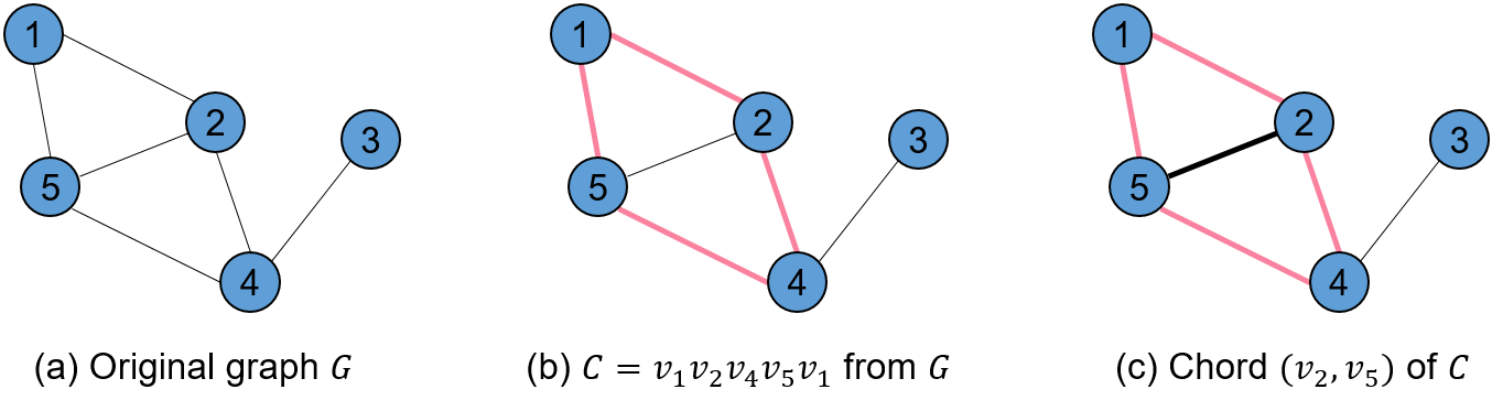 - Chord: Graph $G = (\mathcal{V}, \mathcal{U})$의 cycle $C = (\mathcal{V}(C), \mathcal{U}(C))$에 대하여, $u \in \mathcal{U}, u \notin \mathcal{U}(C)$이면서 $C$에 포함된 두 node를 연결하는 것을 chord라고 한다. 그림 5는 chord에 대한 한 예시를 보여준다.