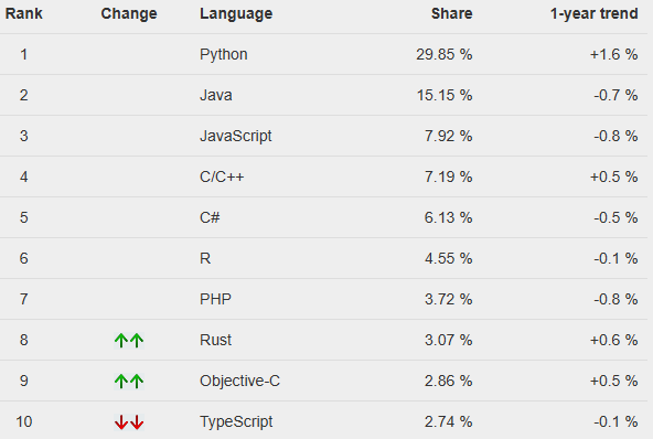 TIOBE Index 와 비교할 때, PYPL Index에서 가장 눈에 띄는 것은 Rust라는 프로그래밍 언어의 인기이다. Rust는 메모리 안정성과 성능 및 편의성에 중점을 둔 프로그래밍 언어이며, C++의 대체재로써 개발되었다. 최근 AWS나 Microsoft 같은 거대 IT 기업에서 자신들의 제품을 Rust로 개발한다는 등의 소식이 전해지면서 개발자들 사이에서도 Rust에 대한 관심이 증가하고 있는데, 이러한 것들이 Rust의 인기 상승 요인 중 하나로 보인다.